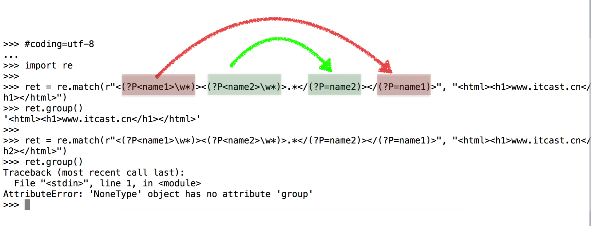 ret = re.match(r"<(?P<name1>\w*)><(?P<name2>\w*)>.*</(?P=name2)></(?P=name1)>", "<html><h1>www.itcast.cn</h2></html>")