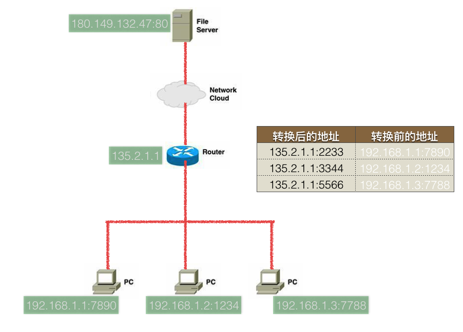 - 接收数据时,在经过路由器时转换为路由器之前记录的ip以及port