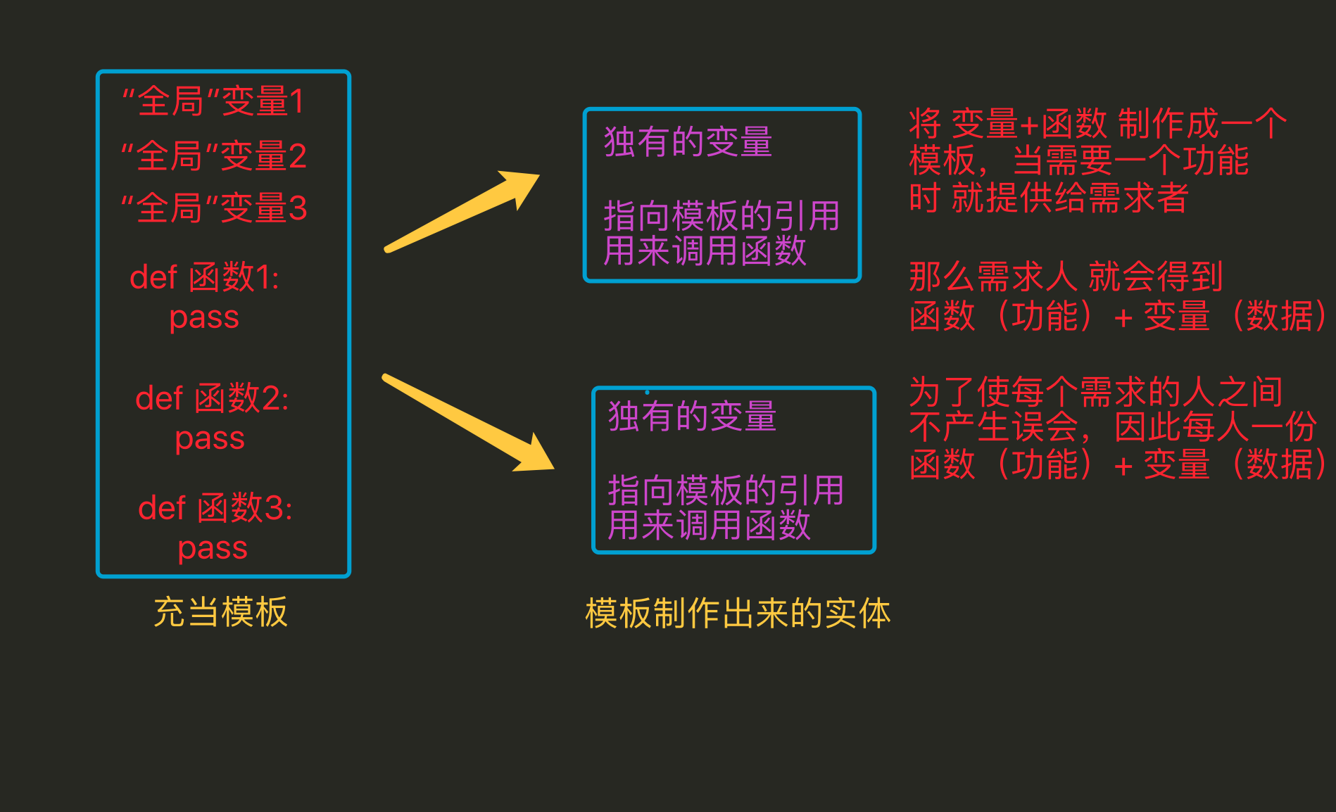 - 在使用面向过程编程时,当需要对数据处理时,需要考虑用哪个模板中哪个函数来进行操作,但是当用面向对象编程时,因为已经将数据存储到了这个独立的空间中,这个独立的空间(即对象)中通过一个特殊的变量(__class__)能够获取到类(模板),而且这个类中的方法是有一定数量的,与此类无关的将不会出现在本类中,因此需要对数据处理时,可以很快速的定位到需要的方法是谁 这样更方便