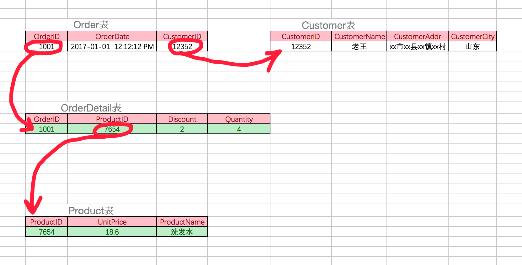 可以把【OrderDetail】表拆分为【OrderDetail】(OrderID,ProductID,Discount,Quantity)和【Product】(ProductID,UnitPrice,ProductName)来消除原订单表中UnitPrice,ProductName多次重复的情况。