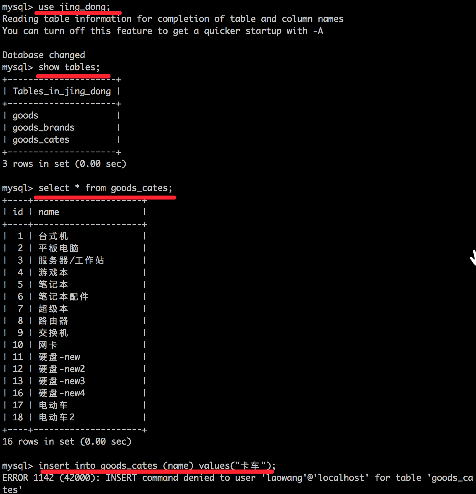 grant select on jing_dong.* to 'laowang'@'localhost' identified by '123456';